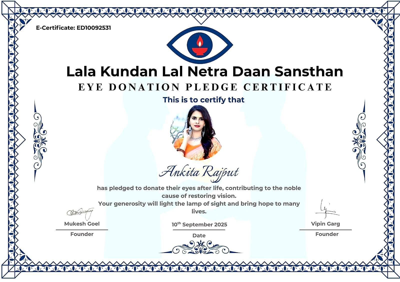 अंकिता राजपूत ने स्वयं जीवन उपरांत अपने नेत्रदान भी किये हैं उनका कहना हैं कि उनके नेत्र किसी गरीब बच्चे को दिये जाये जिससे वो इस खूबसूरत दुनिया को देख पाये और एक जीवन का अन्धकार दूर होकर प्रकाशमय बन पाये अंकिता ने और लोगो को भी आहवान किया